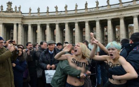 Toplam 4 kadından oluşan Femen aktivistleri, Papa 16'ncı Benedict'in konuştuğu sırada kıyafetlerini çıkardı. Vücutlarının Belden yukarısı tamamen çıplak kalan göstericilerin vücutlarında yazılı 'In Gay We Trust' (Eşcinsellere güveniyoruz) cümlesi dikkat çekti.